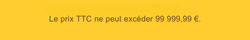 Alerte de prix aberrant : un bandeau jaune vous informe si le prix TTC dépasse 99 999,99 € – impossible de valider un montant erroné.