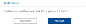 Confirmation de saisie : si le prix TTC saisi dépasse 1000 €, une fenêtre de confirmation s’ouvre pour valider votre action.